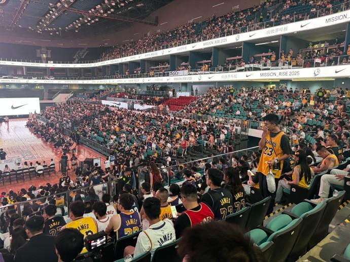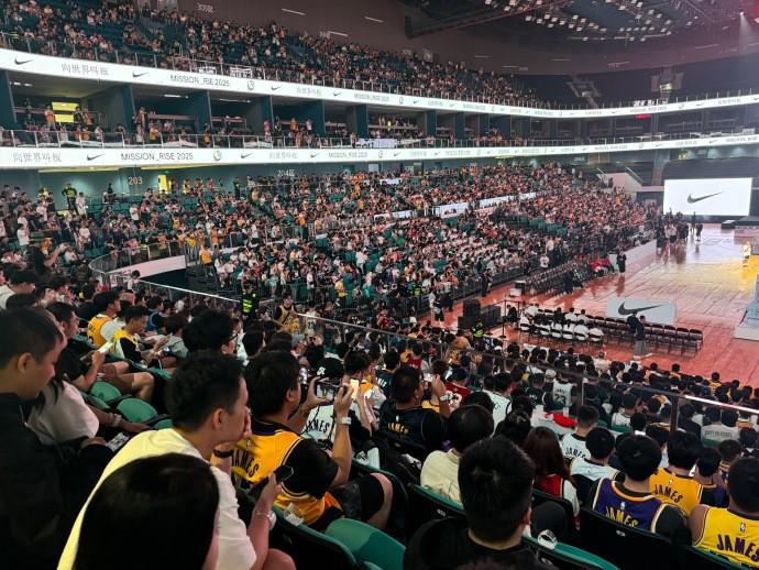 在下午的时候,詹姆斯曾与中国男篮队长赵睿一同观看了国青男篮的训练。在结束了这一部分的活动后,詹姆斯下一站启程来到成都高新体育馆,进行线下活动。据博主“詹姆斯吧官方微博”社媒消息,成都高新体育馆在詹姆斯到来前已经人山人海,几乎座无虚席,现场方面也已经做足了准备。